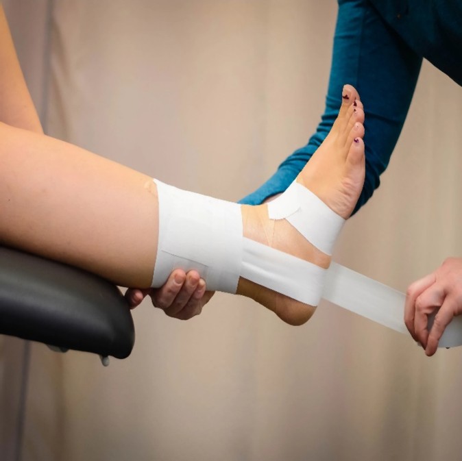 Klassieke witte tape is een niet-elastische tape die een specifiek gewricht helpt ondersteunen en de mate van bewegen limiteert (vb. bij het verzwikken van de enkel of de knie).